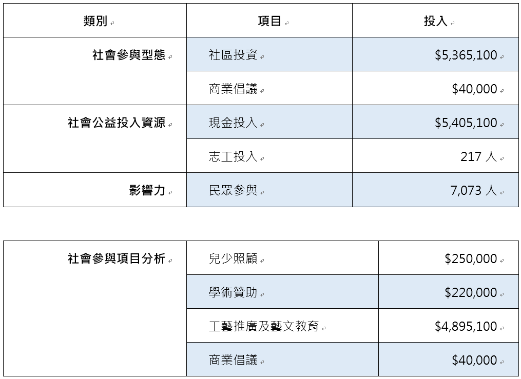 2023年度,集團社會投資總額達到新臺幣5,365,100元。這些投入包括對外的公益捐款贊助、支持財團法人宜蘭吳沙文化基金會、福委會公益活動及商業倡議活動等。桓達集團與財團法人宜蘭吳沙文化基金會持續攜手,在員工關懷照撫、豐富在地藝文底蘊、鼓勵國家幼苗精進以及扶助關懷生命等方面繼續努力,致力於社會關懷與公益相關議題,支持偏鄉學子文化傳承,並引導藝術展演陶冶文化等。透過長期且持續性的合作模式,為共榮共好的社會願景持續努力。