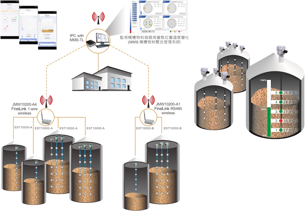糧食安全行動監控系統提供主機單機版、雲平台主機版、手機平板APP等多種系統組合,相較市面上多為不易擴充之封閉性系統架構,MMS其智慧型開放架構最多可彈性擴充達255個糧倉,且每一糧倉最多可任意安裝19條EST,完全適用不同大小糧倉群,輕易達到有效管理目的。